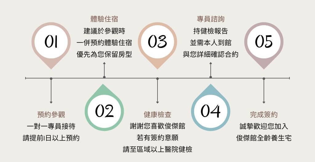 參觀流程:填寫基本資料→評估入住資格→介紹當期方案→參觀公共區域→參觀客房設備